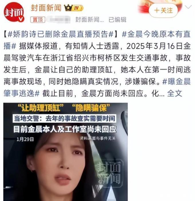 肇事顶包那年三月十六日,金晨在浙江绍兴开车的时段里出了点事儿,撞到了围墙和路牌,助理也被轻微划伤了。可她没有留在那儿处理,还跑去了上海看病,把助理一个人留在了现场。