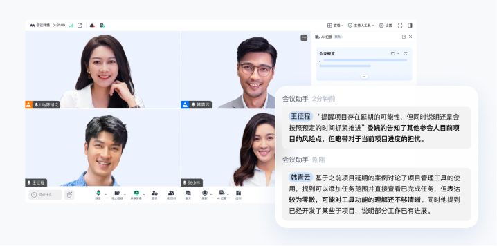 在会议过程中,此次腾讯会议更新,做到了会议纪要输出速度快,在AI助力下,每2分钟自动刷新内容,其中包含近2分钟的实时讨论要点,以及从会议开始到当前的完整概要。