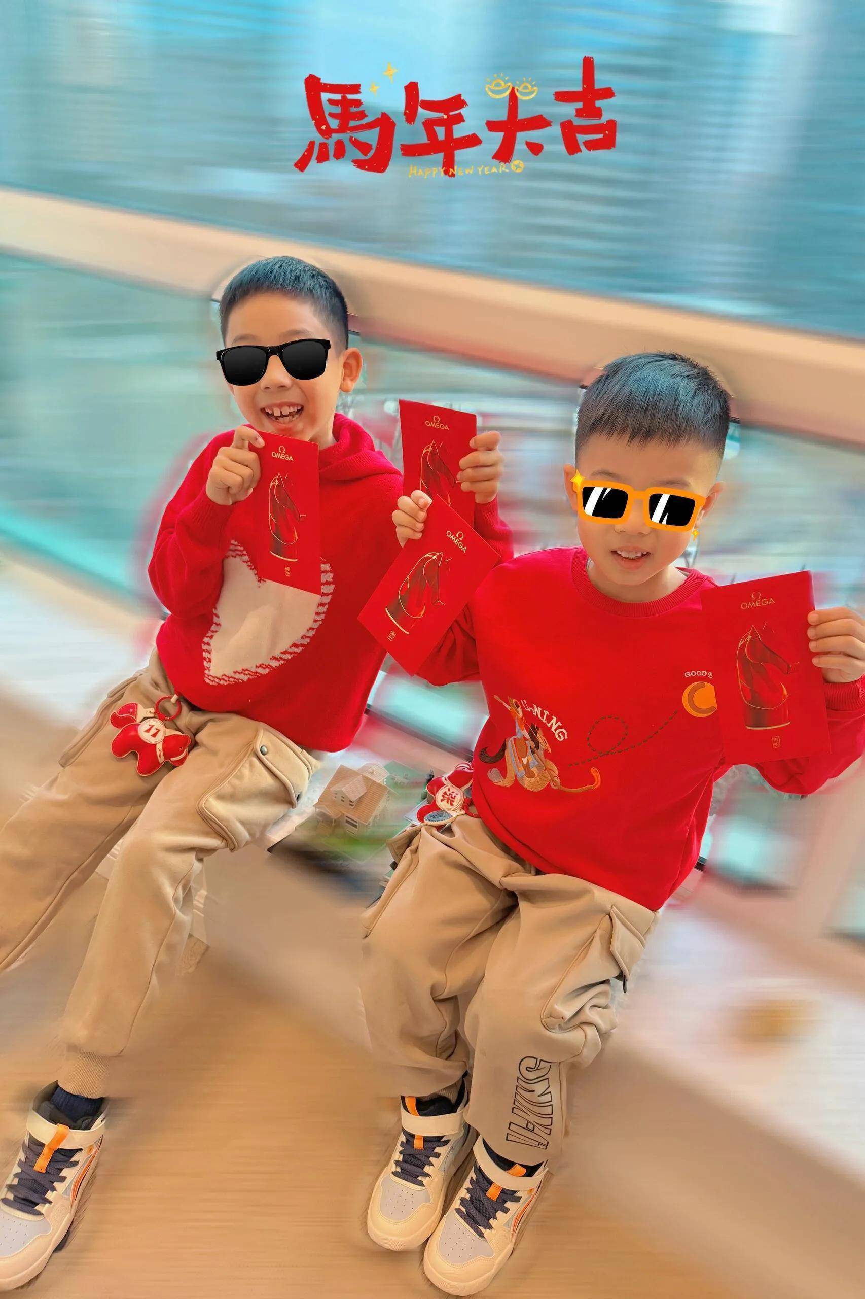 夏露和马龙给两个儿子送了欧米茄家的红包,两个儿子身着红色毛衣,帅气十足。