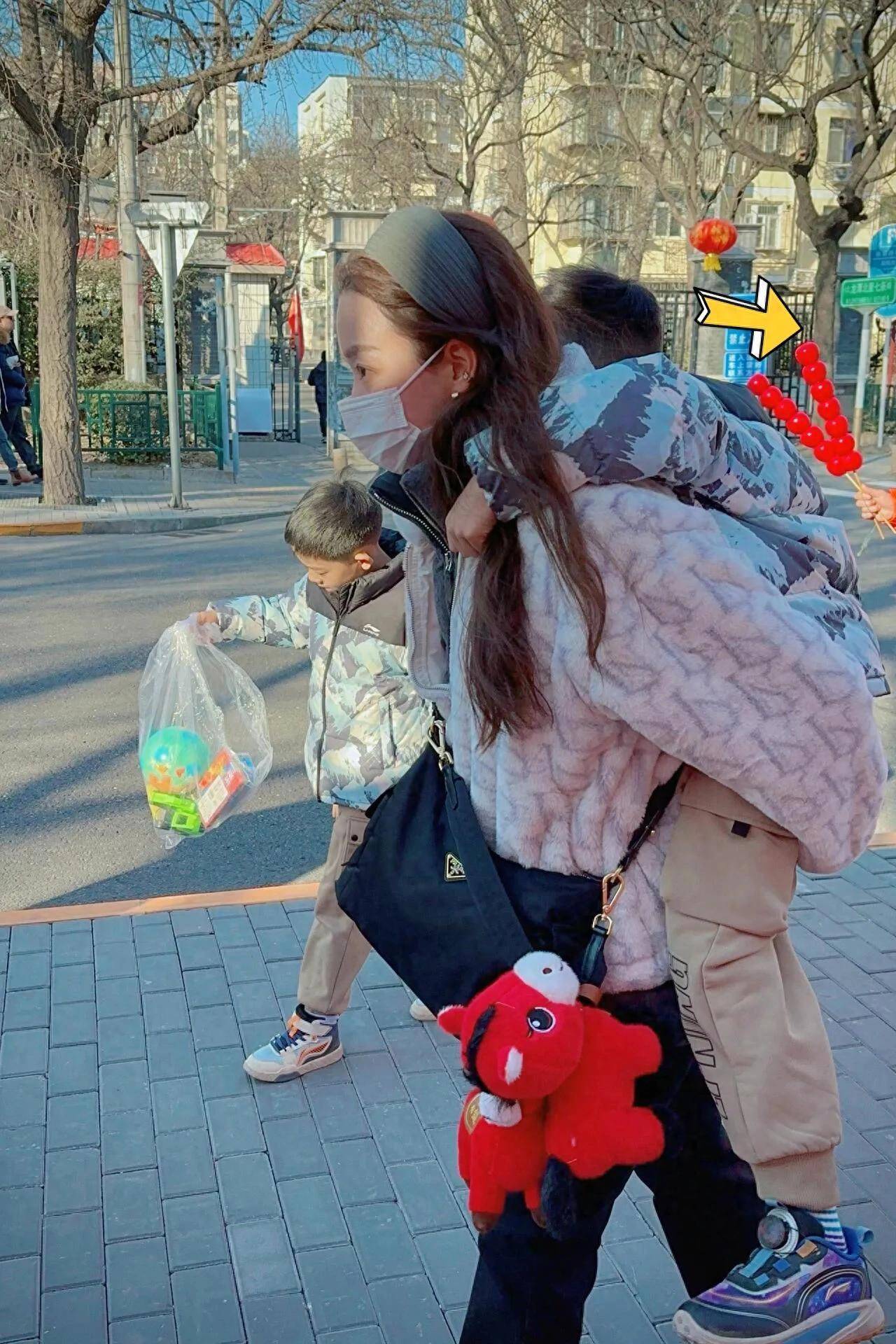 夏露和马龙带着两个儿子外出采购年货归来,夏露背着小儿子马东奥,马里奥手里拎着一包东西。夏露看似瘦弱,实则力量十足,背着儿子时表情轻松,是位称职的好妈妈。马龙手持两根冰糖葫芦跟在母子三人身后,尽显幸福。