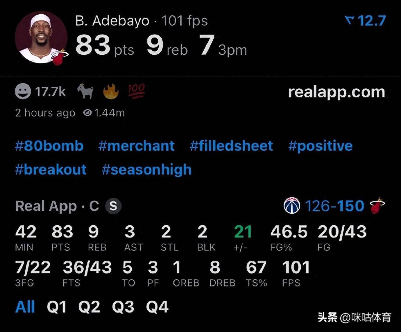 今日NBA常规赛,热火以150-129战胜奇才。阿德巴约在今日热火对阵奇才的比赛中狂砍83分,超越科比的81分独享NBA历史单场得分第二纪录,仅次于张伯伦的100分,全场球迷为其沸腾,成为现役首位突破80分的球员。阿德巴约开场即进入“杀神模式”,单节16投10中(三分8中5,罚球7中6),轰下31分,打破詹姆斯保持的热火队史单节得分纪录(25分),并成为NBA历史单节得分第二高球员(乐福34分第一)。